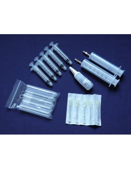 Zestaw akcesoriów służący do napełniania i konserwacji strzykawek Telinject o pojemności 1 ml, 3 ml, 5 ml, 10 ml, 15 ml i 20 ml.